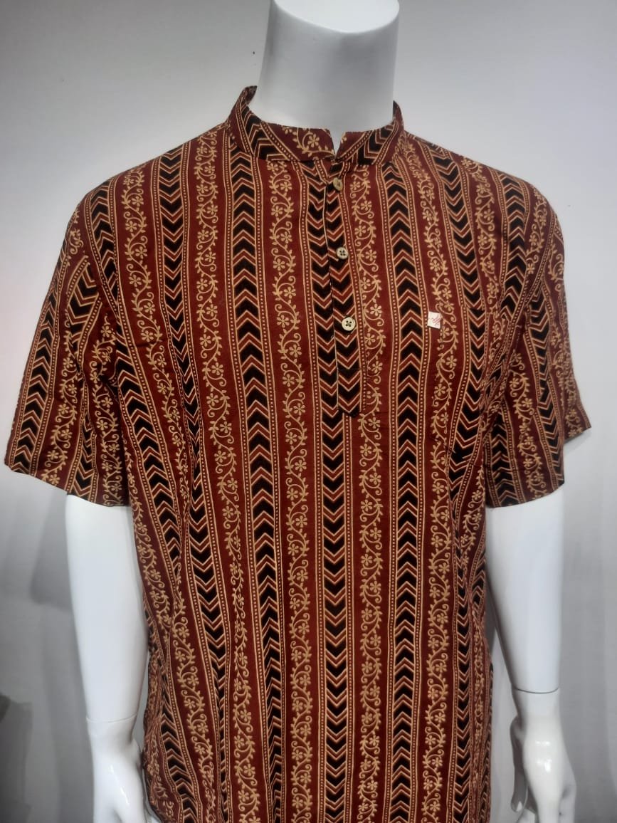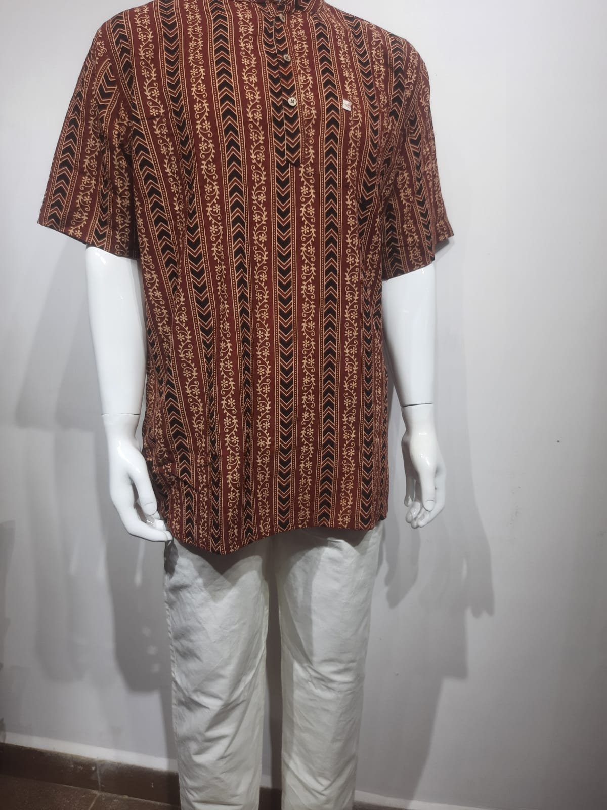 This pure cotton kurta with its simple yet beautiful Ajrakh print adds a cool and ethnic touch to your wardrobe. The maroon and black combination, along with the smart mandarin collar, gives it a stylish and traditional look. You can pair this kurta easily with jeans, black pyjamas, or beige pants for a perfect everyday or festive outfit.