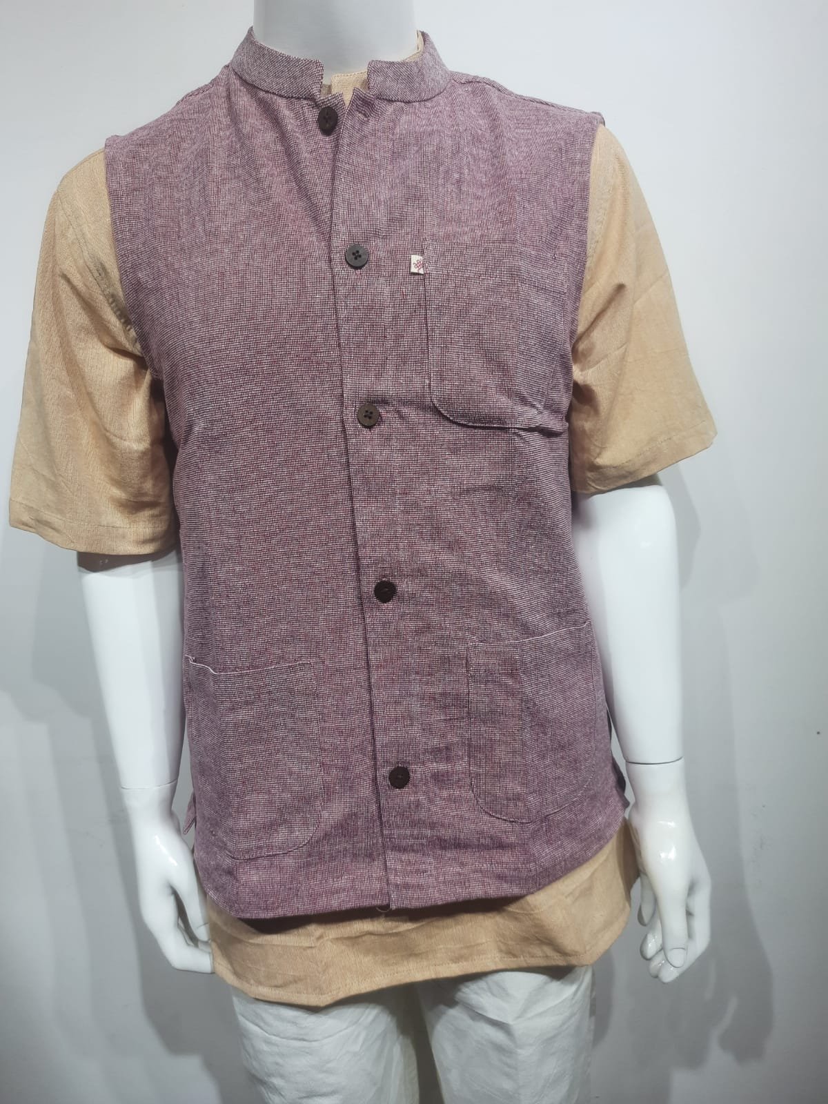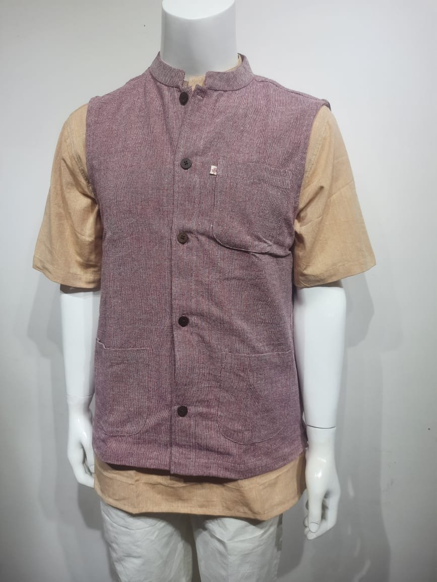 Material : Handloom Cotton Style : Sleeveless Jacket Craft : Handwoven Fabric Pattern : Subtle Texture Weave Neck : Mandarin Collar Sleeves : Sleeveless Fit : Regular Fit Length : Waist Length Occasion : Festive, Formal, Everyday Ethnic Pockets : 3 Functional Pockets