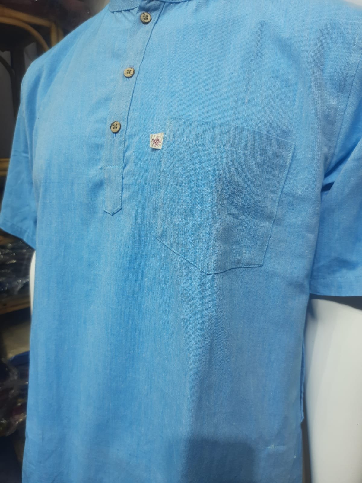 This cool blue short kurta is perfect for everyday wear. Made from pure handloom cotton, it keeps you light and comfortable even on the hottest days. The soft fabric, mandarin collar, and wooden buttons give it a smart and simple look. Whether it’s for office, casual outings, or daily use, this kurta is easy to wear and style with pyjamas or jeans—any day of the year.