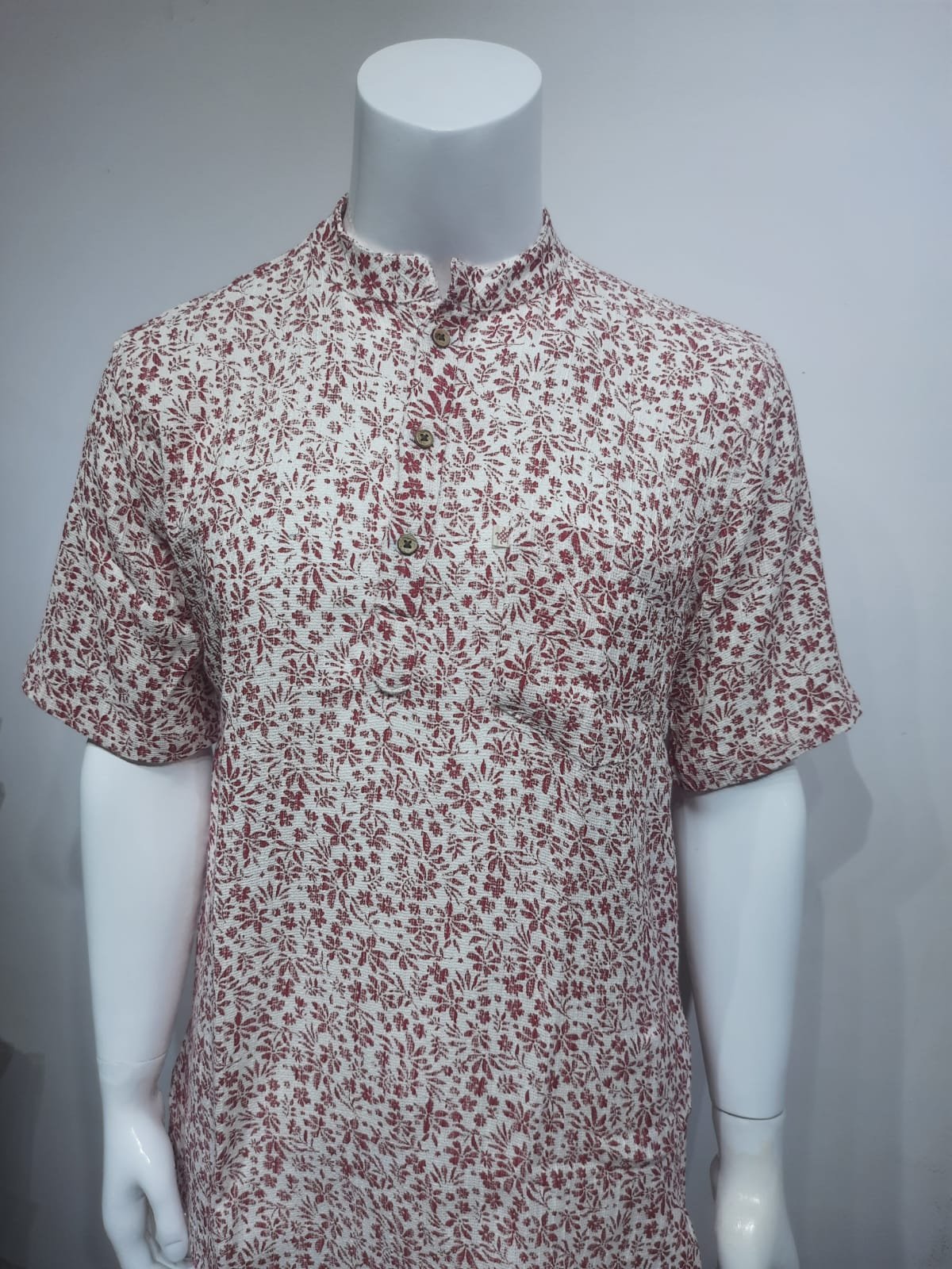 This White with Red Floral Print feels light on the skin. The fine cotton fabric keeps you cool, while the small flowers add a calm, traditional look. The regular fit and mandarin collar make it easy to wear for everyday use, temple visits, or small family gatherings. It pairs well with white pyjamas or light trousers and feels just right for a peaceful day.